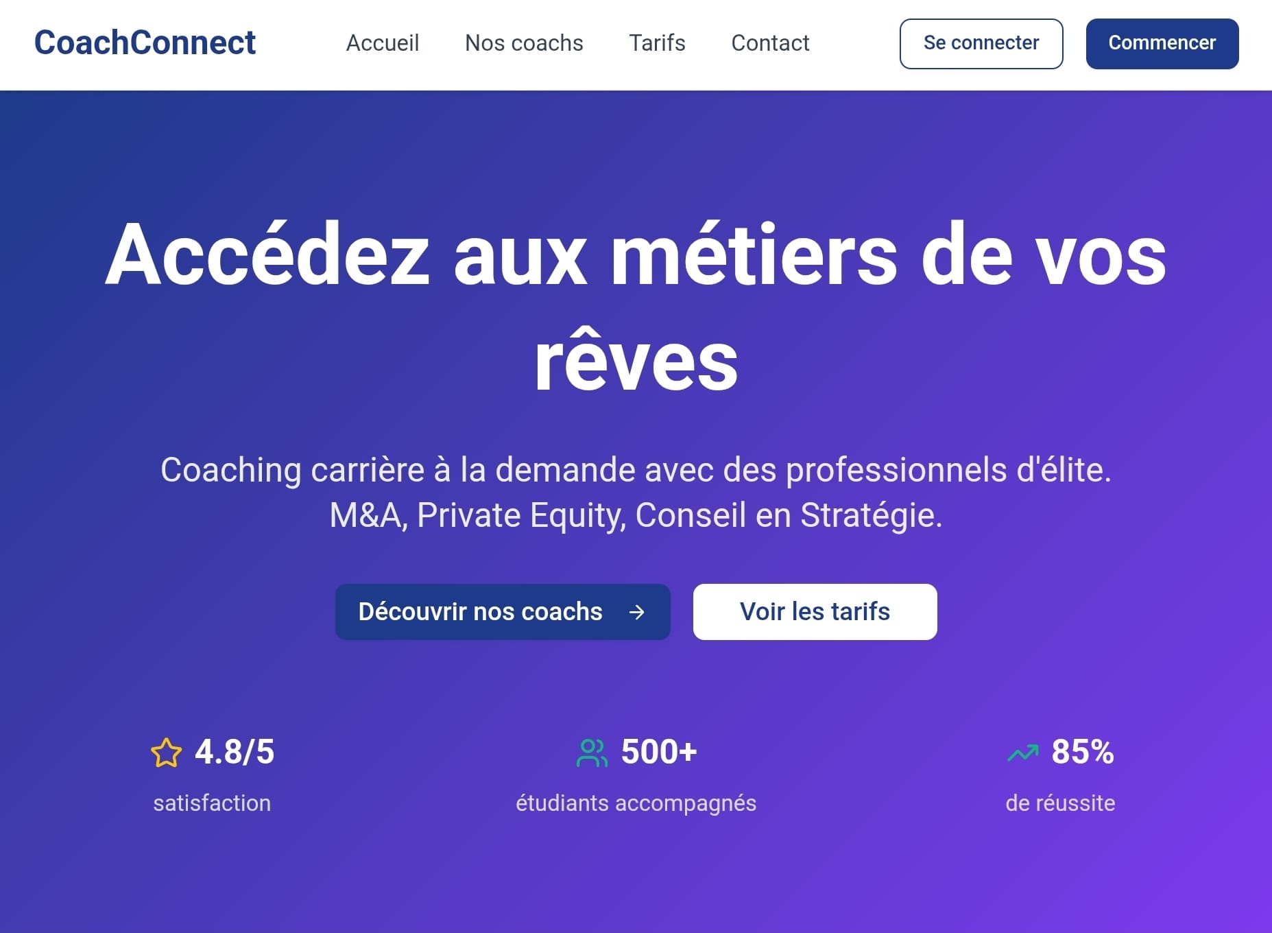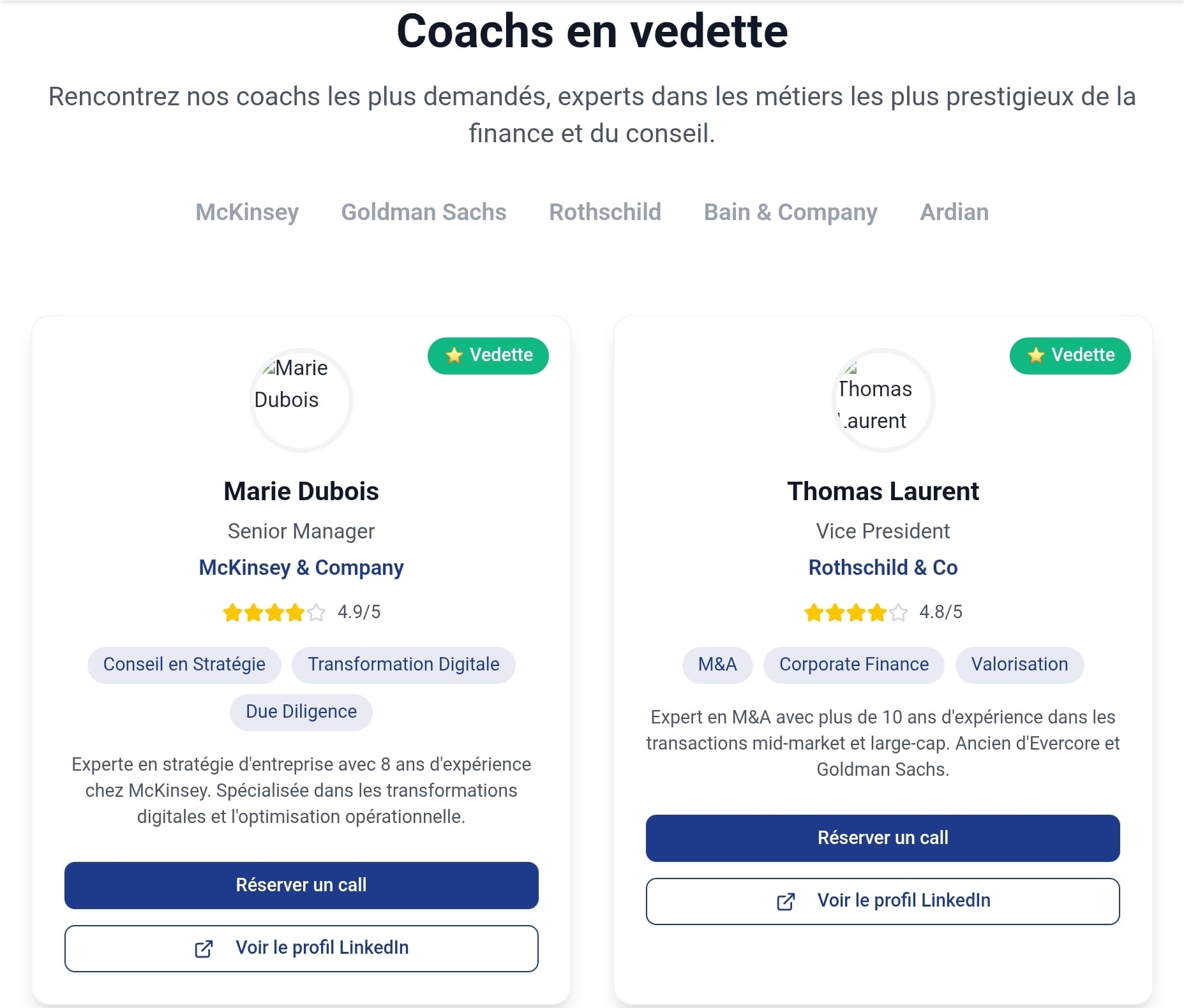 Aujourd’hui, on a besoin de votre avis pour construire un projet inédit : une application pensée par et pour les étudiants, qui démocratise l’accès aux métiers du M&A, du Private Equity et du conseil en stratégie. Imaginez : réserver la veille une simulation d’entretien ou une discussion métier avec un pro de McKinsey, Rothschild, Ardian… le tout en quelques clics, avec un matching instantané façon Uber ou Tinder du coaching carrière (images maquette en avant-première ci-dessous).